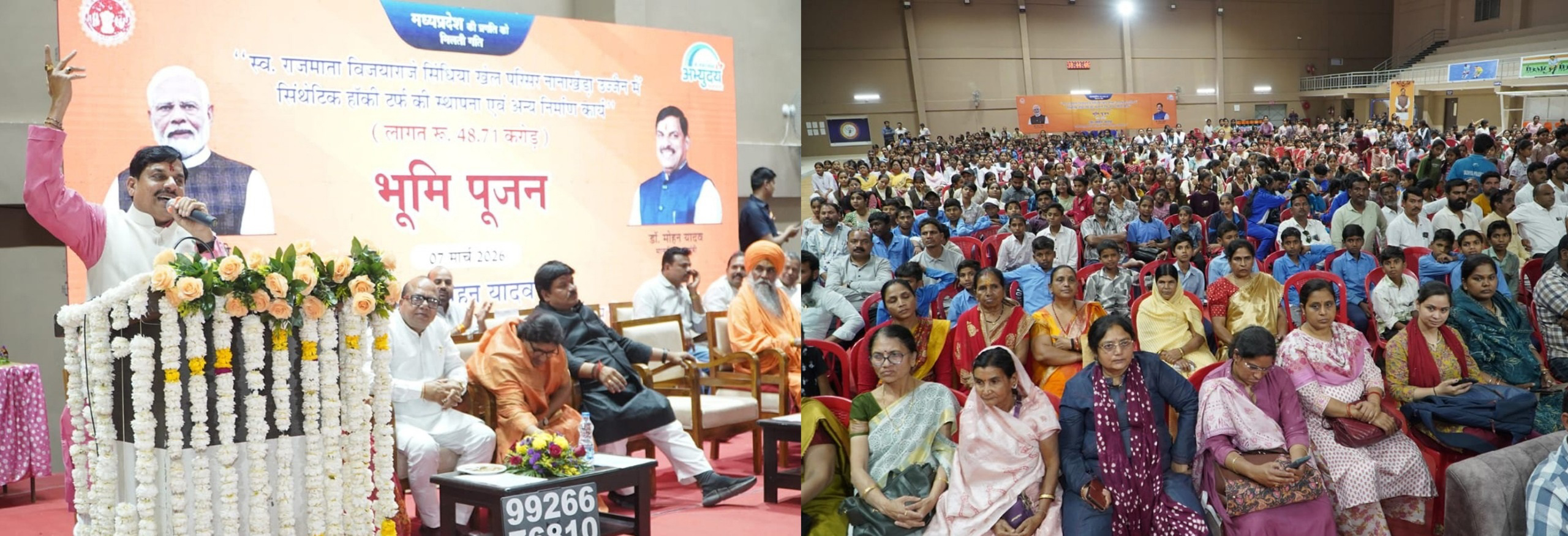 मुख्यमंत्री डॉ. मोहन यादव ने कहा कि भगवान महाकालेश्वर और गोपाल कृष्ण की हम सभी पर विशेष कृपा है। उनके आशीर्वाद से आज उज्जैन और पूरे प्रदेश के खिलाडियों को सौगात मिलने जा रही है। स्पोर्टस कॉम्प्लेक्स में निरंतर उज्जैन में विकास के कार्य हो रहे है। खेल केवल मनोरंजन नहीं बल्कि शारीरिक, मानसिक एवं सामाजिक विकास का सशक्त माध्यम है। खेल अनुशासन, टीम भावना, नेतृत्व क्षमता और सकारात्मक प्रतिस्पर्धा की भावना विकसित करते हैं। मुख्यमंत्री डॉ. यादव ने शनिवार को उज्जैन में स्व. राजमाता विजयाराजे सिंधिया खेल परिसर नानाखेडा स्टेडियम परिसर में 48.71 करोड रुपए की लागत से बनने वाले अंतर्राष्ट्रीय स्तर के सिन्थेटिक हॉकी टर्फ और पवेलियन दर्शक दीर्घा के निर्माण कार्य के भूमि- पूजन कार्यक्रम को संबोधित करते हुए ये बातें कही।